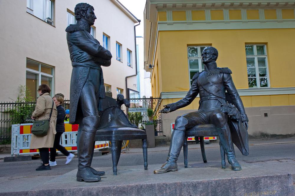 Kappelista lähdimme kävelemään jokirantaa pitkin satamaan päin. Opas kertoi kirjaston historiasta ja talon lahjoittajasta, kauppaneuvos Fredric von Rettigistä. Siirryimme ”Tapaaminen Turussa 1812” -patsaan luo, jossa kuvataan Ruotsin kruununprinssi Kaarle Juhanan ja Venäjän keisari Aleksanteri I neuvottelua Euroopan valtapoliittisista kysymyksistä.