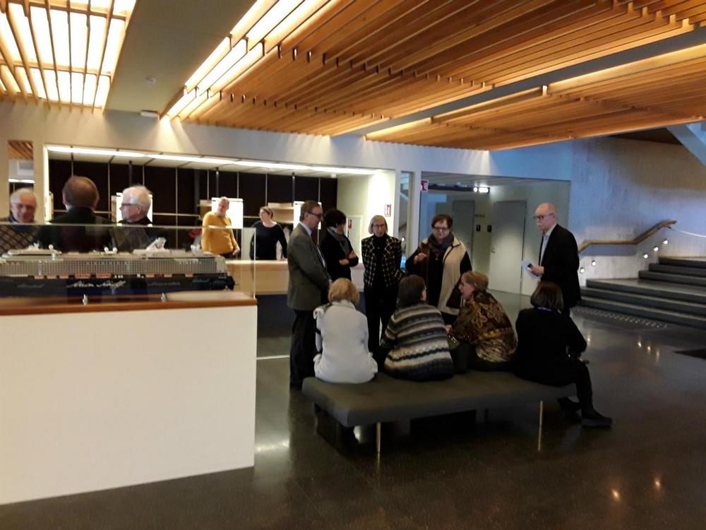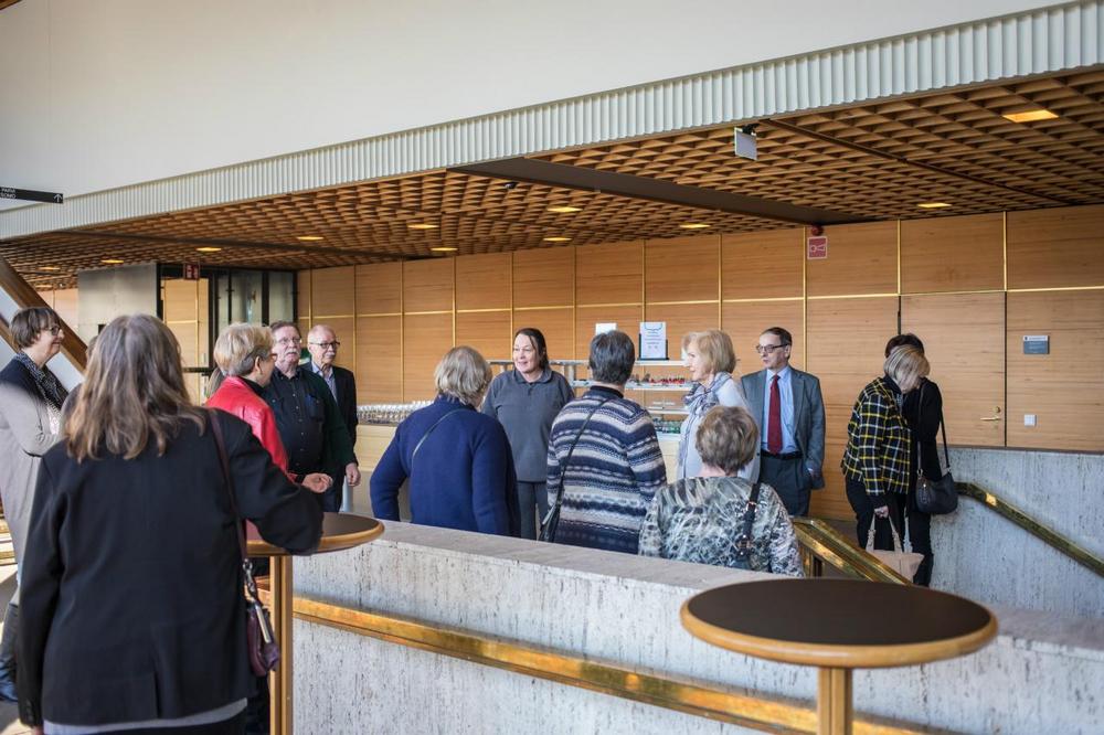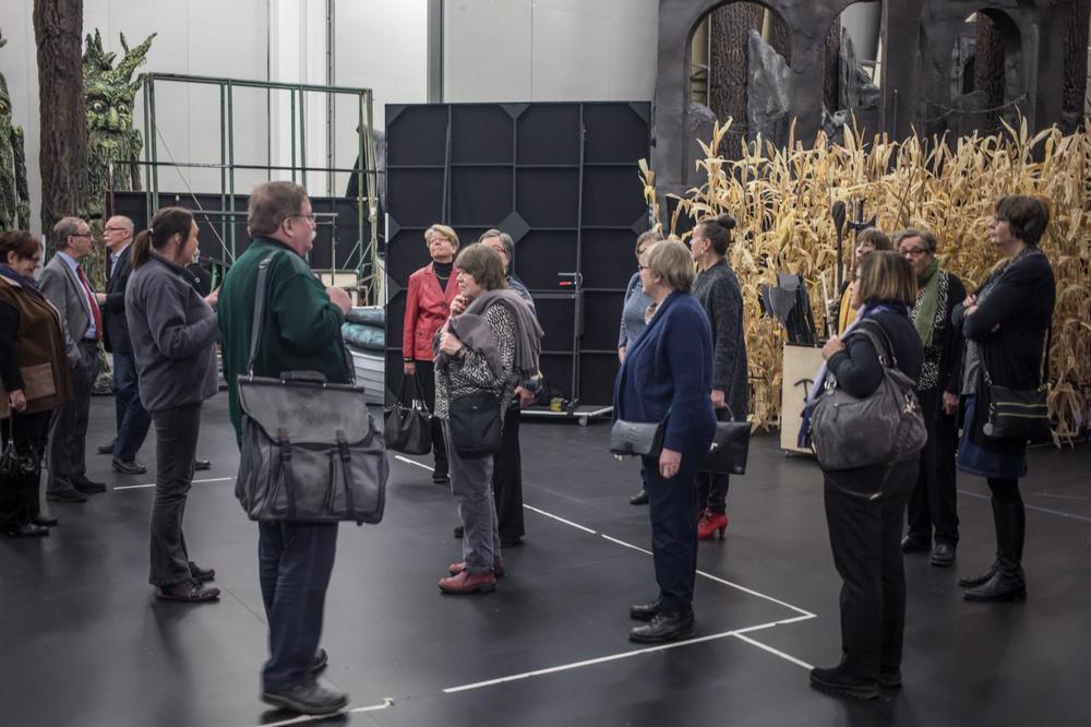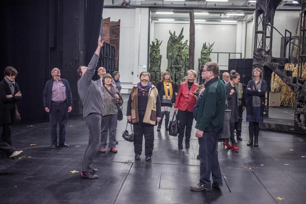 No, leivoskahvien jälkeen pääsimme tutustumaan uudistuneen teatterin yleisötiloihin ja harvemmin nähtyihin näyttämön takaisiin työtiloihin.