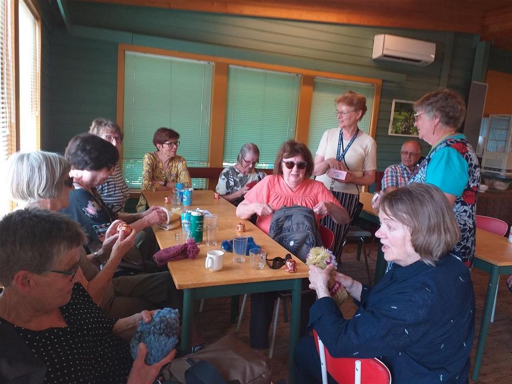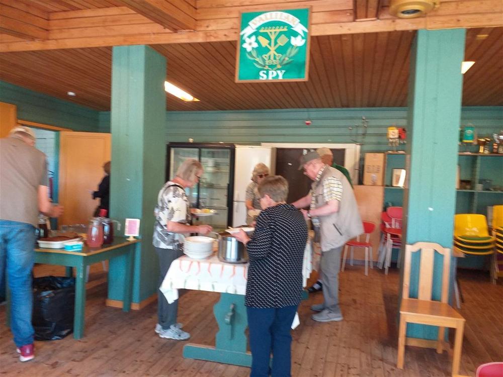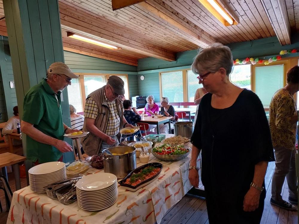 Päivä aloitettiin puolilta päivin kerhotalolla ja sen pihamailla monipuolisen lounaan ja iloisen seurustelun merkeissä. Raija ja siskonsa Seija olivat yhdessä valmistaneet tarjottavat myös puutarhan tuotteita hyödyntämällä ja ilmeisesti kukaan ei jäänyt nälkäiseksi.