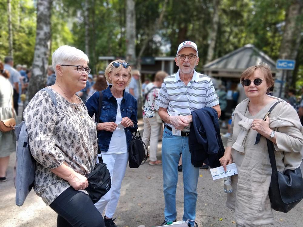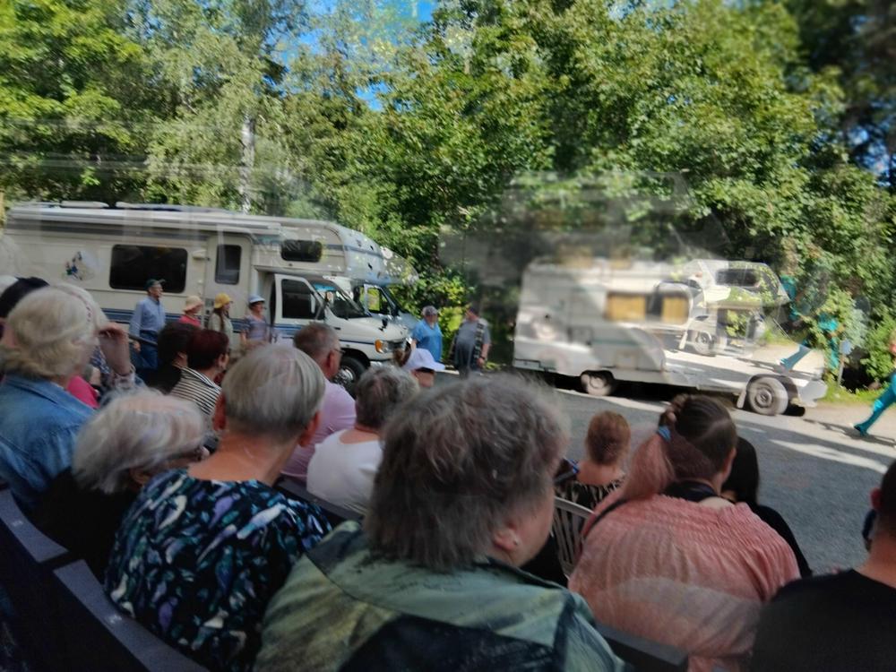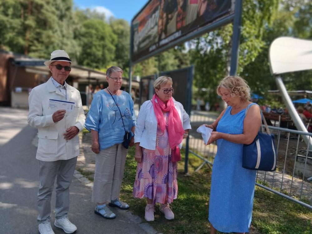 Mukana näytöksessä oli 26 henkilöä. Näytös oli hauska ja mukaansatempaava. Loistavat näyttelijät Aimo Räsänen ja Lari Halme etunenässä. Kyllä kelpasi katsella. Pyörivä katsomo järvimaisemilla. Myös sää suosi meitä.