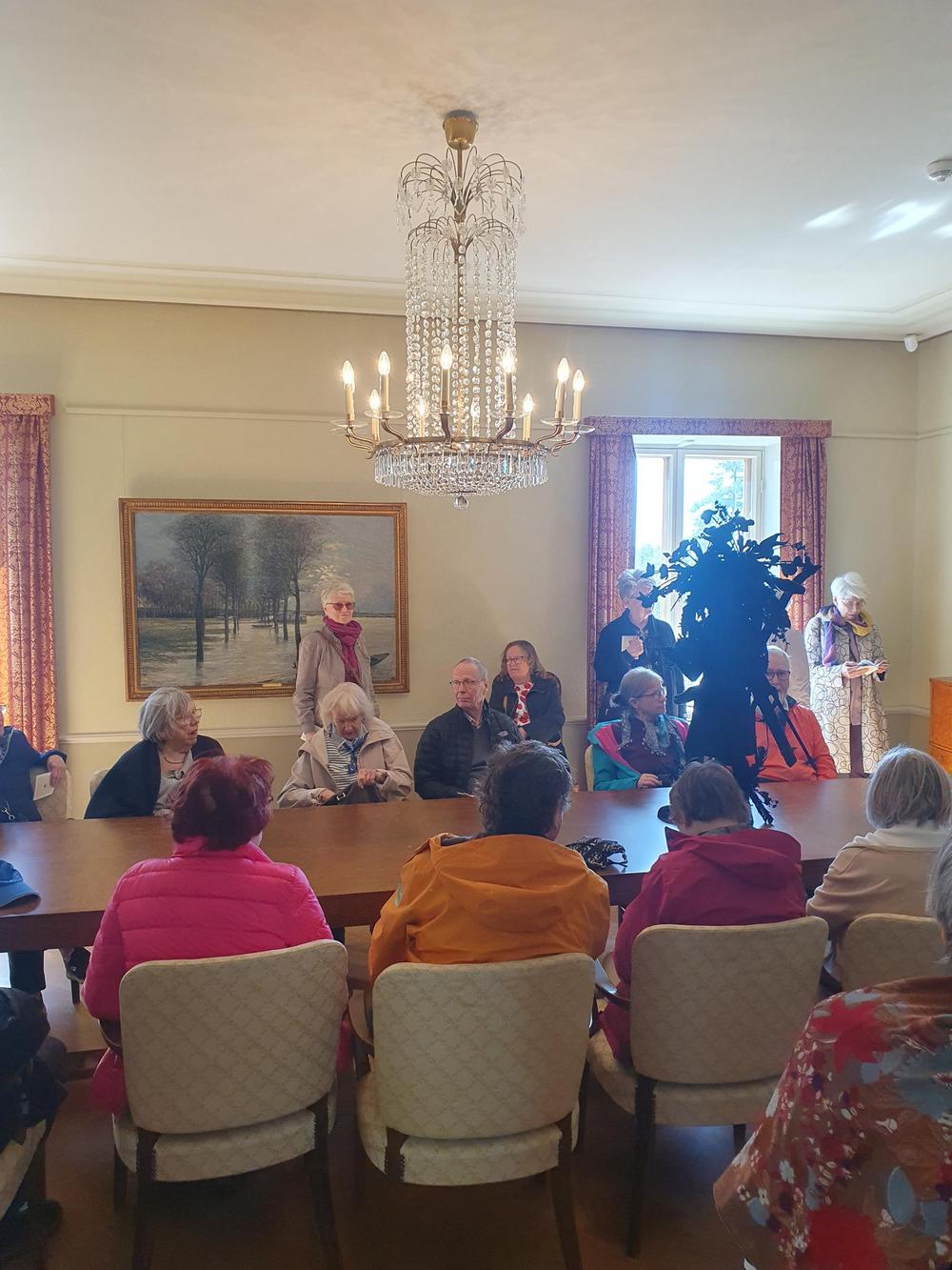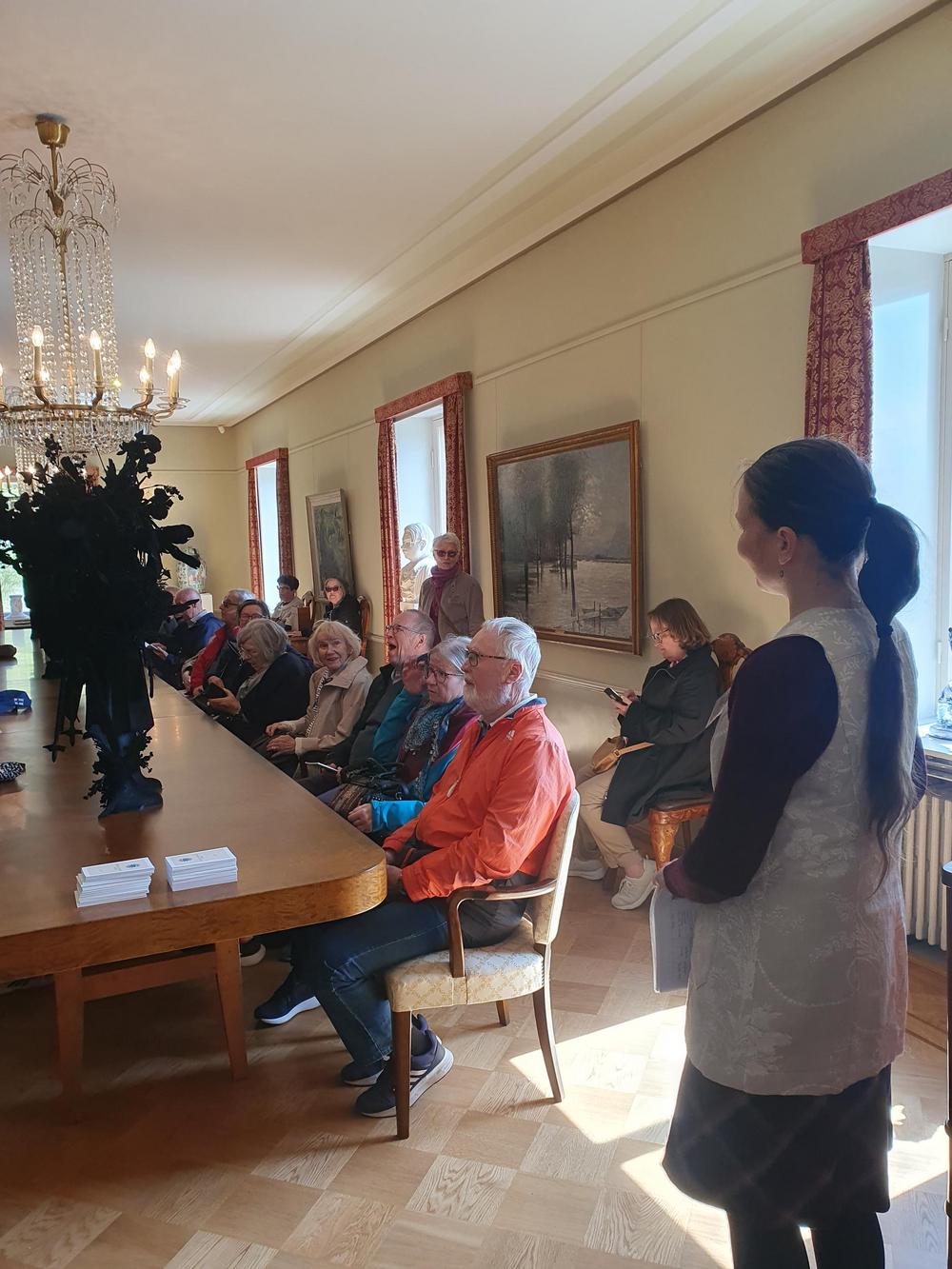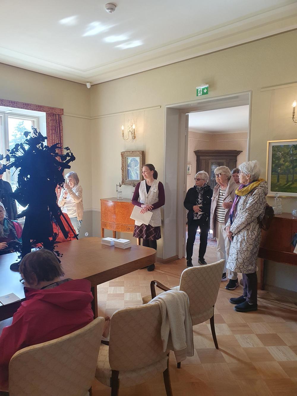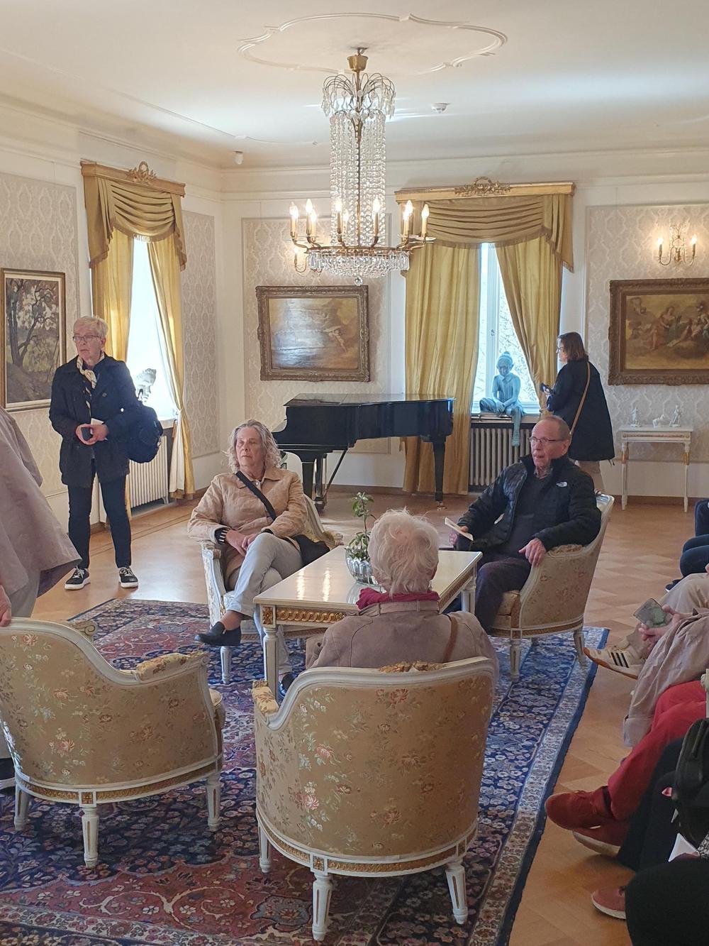 Kemiöstä bussiin tuli mukaan paikallisopas Calle, joka matkalla Söderlångvikin museoon kertoi mielenkiintoisia asioita Kemiönsaaren historiasta ja nykypäivästä. Söderlångvikin museo on toiminut liikemies ja taidemesenaatti Amos Andersonin huvilana 1927–1961. Kartanossa tehtiin peruskorjaus 2018–2020 ja se palautettiin siihen asuun ja tunnelmaan, mikä sillä oli 1930-luvulla.Museon intendentti kertoi meille rakennuksesta ja Andersonin elämästä siellä. Kiersimme talon saleja oppaan johdolla ja ihailimme upeita taideteoksia. Osallistujat saivat pienen kirjasen, joka kertoo museosta ja sen taideteoksista. Meren rannalla olevalla maatilalla kasvaa noin 20.000 omenapuuta. Siellä jalostetaan ja myydään omenoita ja tilapuodista voi ostaa omenista tehtyjä herkkuja sekä paikallisten taiteilijoiden käsitöitä.